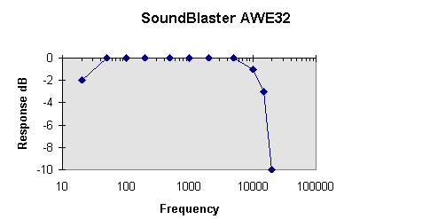 Accoring a newer test I saw in Tietokone magazine 1996, the frequency response in AWE32 has changed. The high frequency response has been become better, but the bass response have become worse: Bass response starts to drop at 200 Hz and drops 6..12 dB at 20 Hz depending on the input/output combinations. So the frequency response in new AWE32 cards is quite the same like in old SB16 cards: