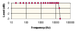 I tested line level frequency response using following method: I used Nakamichi as signal generator to generate sine wave test signals, I used WaveStudio to digitize and play back those samples and finally I measured the output with Nakamichi. The signal levels I used were 0.78 Vrms. The frequency response for this type of recording and playback process can be seen in figure below.